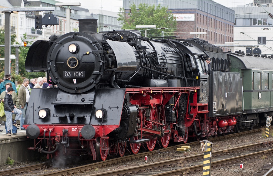 Gleich geht es los. Die 03 1010 wurde früher auch mit grüner Vollverkleidung gebaut. Sie wurde von 1939 bis 1941 als Schnellzuglokomotive mit einer Höchstgeschwindigkeit von 140 km/h gebaut.