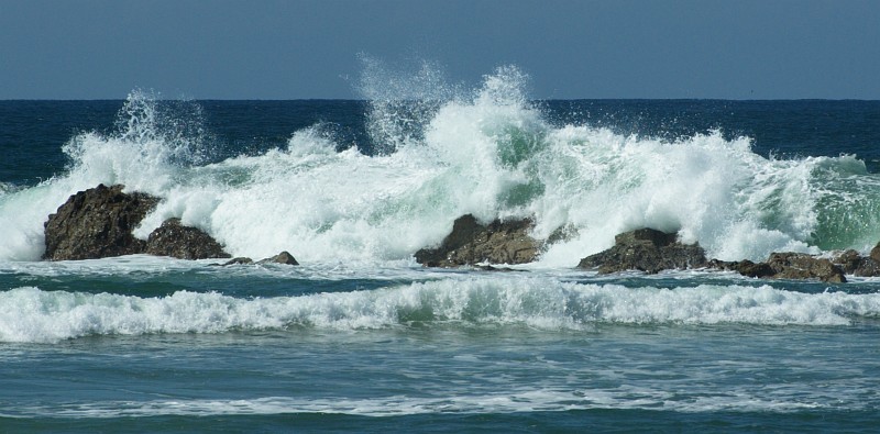 Kraftvoll brechen sich die Wellen an vor der Küste liegenden Felsen.