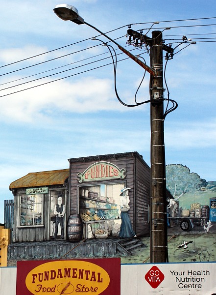 In der Einkaufsstraße von Lismore haben einige Geschäfte phantasievolle Aufbauten auf den Dächern.