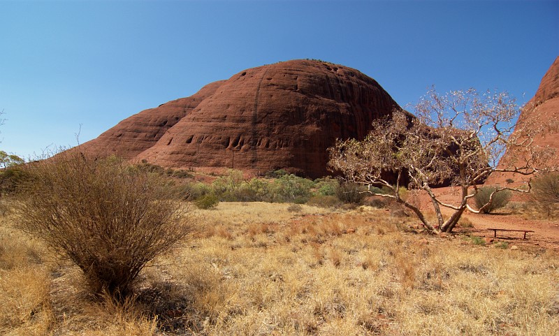 Das gelbe Spinnifex-Gras wächst fast überall. Unter dem Baum rechts wurden 2 Bänke aufgestellt. Viel Schatten hat der Baum allerdings nicht zu bieten.
