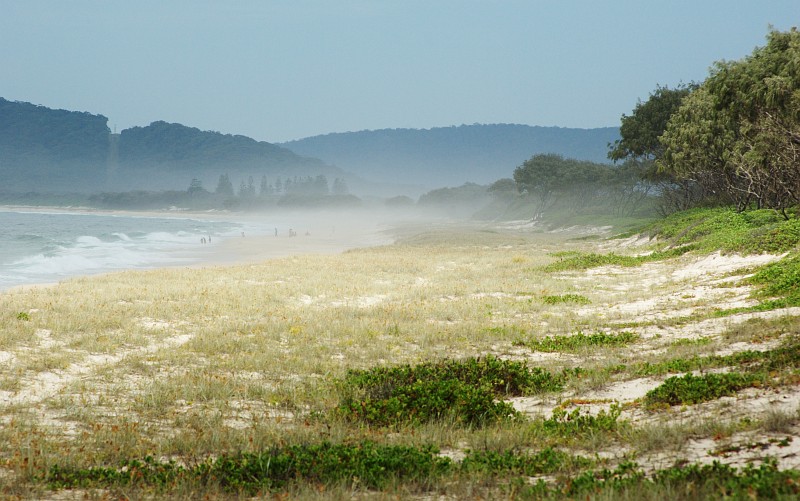 Strand mit Salzwasserpflanzen. Man beachte die enorme Gischt, die meterhoch an Land geweht wird.