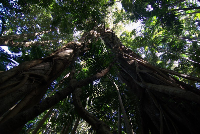 Ein großer Baum (ca. 3m Stammdurchmesser, rechts im Bild) im Würgegriff eines Strangler Ficus. Der Ficus hat schon einen großen Wurzelausläufer (links) gebildet.