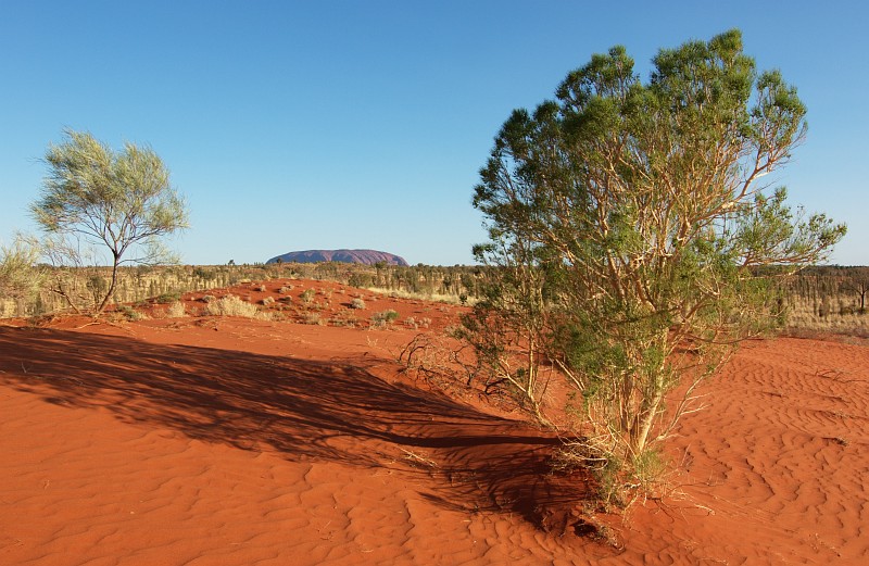 Auf einer ca. 10m hohen Sanddüne westlich von Uluru. Der Felsen ist ca. 20km entfernt.