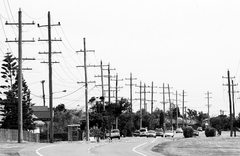 Strommasten an einer Straße in Stockton.