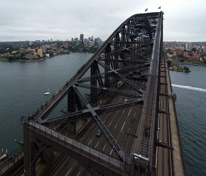 Die Harbour Bridge vom Aussichtspylon aus gesehen. Ich hatte erst geplant, eine Besteigung der Brücke mitzumachen, aber der Andrang ist leider so groß, daß man schon 1 bis 2 Tage vorher reservieren muss. Leider ging am nächsten Tag mein Flugzeug.
