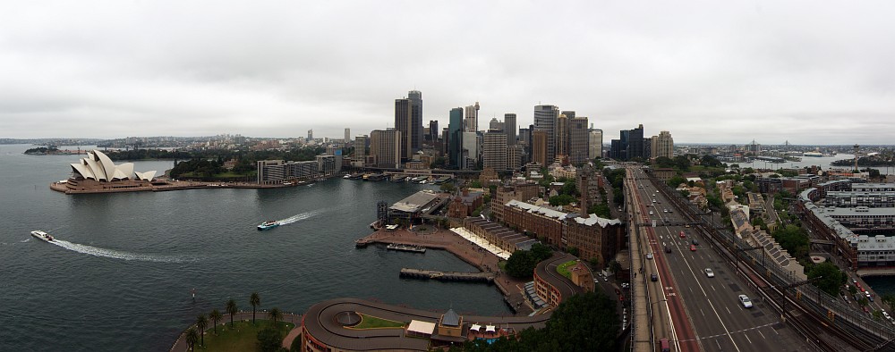 Blick über den Hafen und die Skyline vom Aussichtspylon der Harbour Bridge aus.
