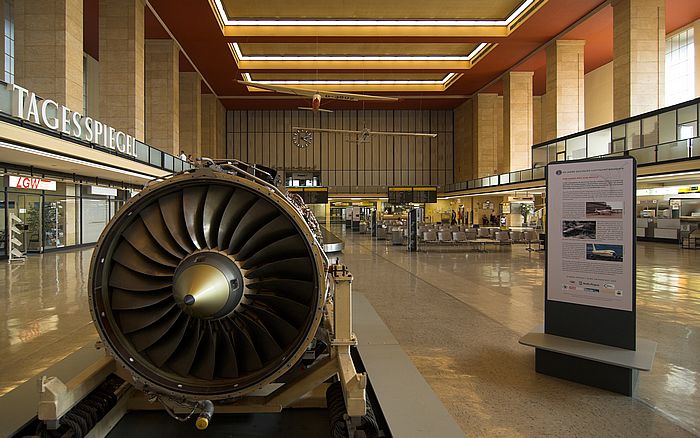 Ausgestelltes Triebwerk in der Abfertigungshalle.