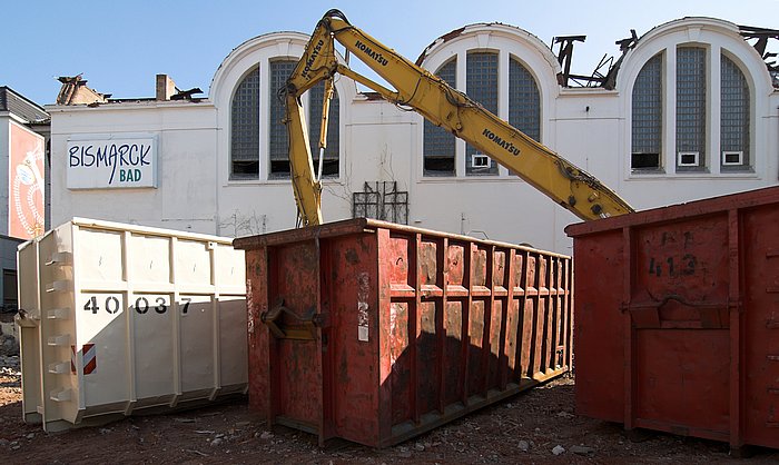 Noch steht die große Halle im Hintergrund, vorne warten schon Container zur Aufnahme des Schutts. (März 2007)