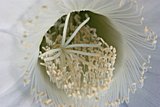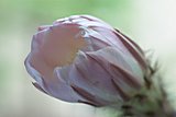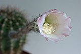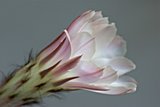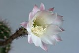 Blüte eines Echinopsis-Kaktus. Echinopsis ist eine sehr weit verbreitete und schlicht aussehende Kugelkaktusart, die überraschend schöne und große Blüten hervorbringt. Die Blüte wächst innerhalb von ein paar Tagen auf eine Länge von ca. 15 bis 20 cm heran und geht dann an einem Abend auf. Der Durchmesser der Blüte erreicht ca. 20cm. Die abendliche Blüte wird von einem durchdringlich süßen Geruch begleitet. Spätestens am nächsten Abend ist die ganze Pracht dann vorbei.