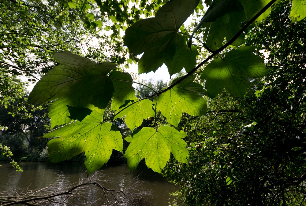 Blick auf den Aßmannkanal im ersten Jahr. Es ist noch alles zugewachsen und ein umgekippter Baum liegt im Wasser.