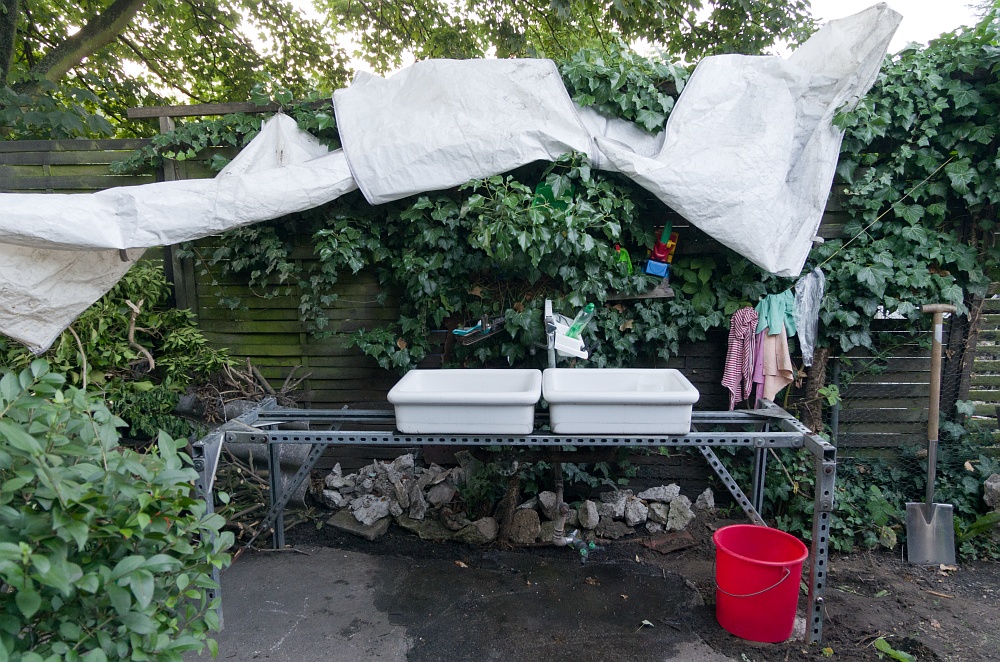 Die neue, aus im Schuppen gefundenen Teilen hergestellte Gartenküche. Endlich ist sie stabil und bietet mehr Platz.