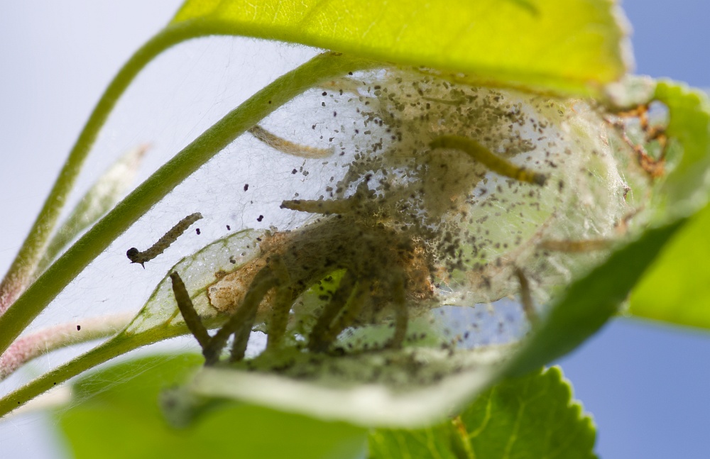 2013 waren die Apfelbäume voller Gespinstmotten. Da hilft nur Absammeln und in die Feuertonne werfen.