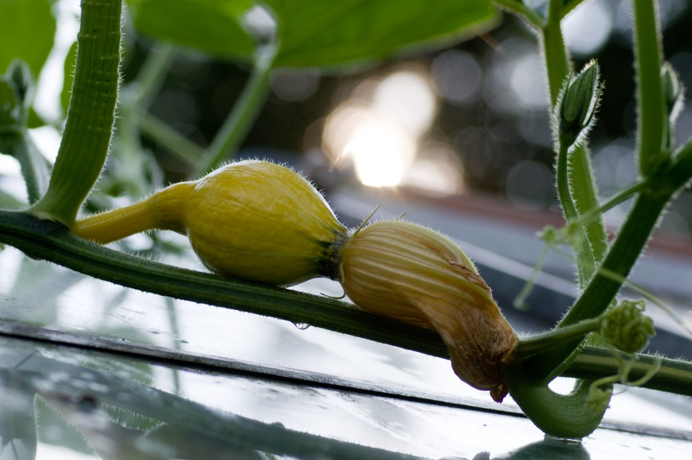 Eine weitere Woche später: Der erste Dachkürbis entwickelt sich (15.8.2015).