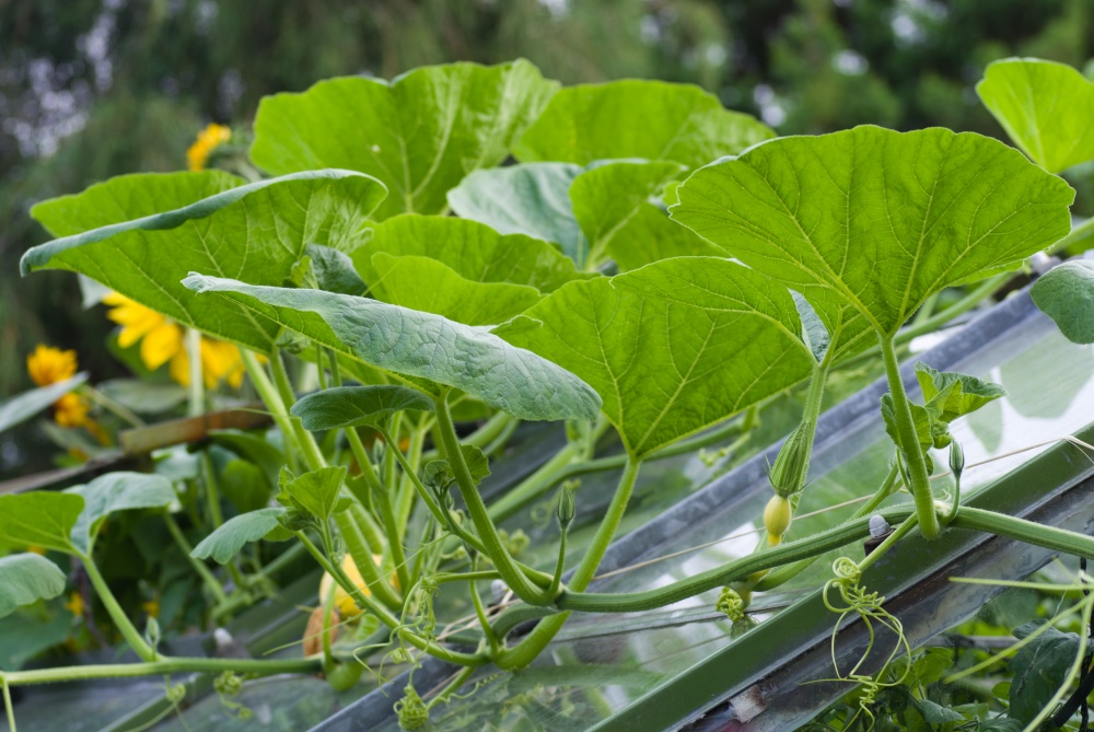 Er bildet dabei ein schattenspendendes Dach für die Tomaten (16.8.2015).