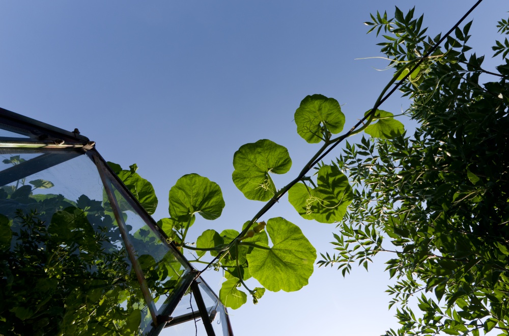 Auf dem Weg zur Terrasse. Der erste kleine Hängekürbis ist zu sehen (22.8.2015).