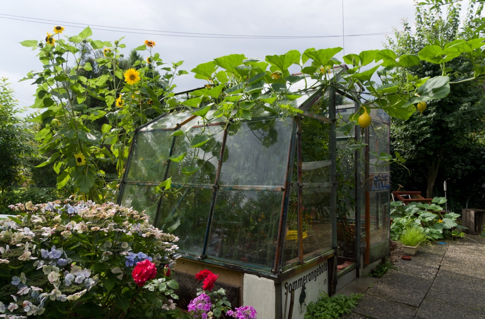 Nach nichtmal 5 Wochen hat der Kürbis das Gewächshaus voll im Griff (30.8.2015).