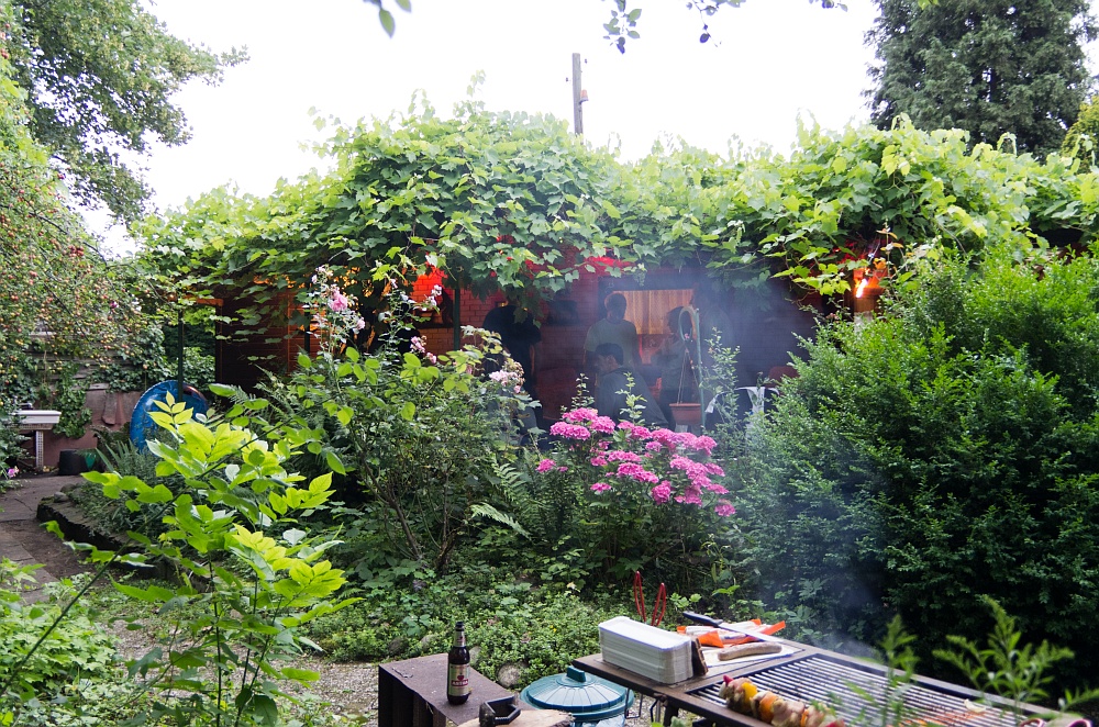 Die Laube, wie sie 2011, bei der Übernahme des Gartens, ausgesehen hat. Der Wein überwuchert alles, im Hintergrund steht noch eine riesige Eibe.
