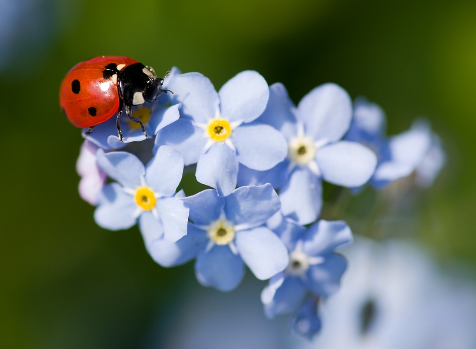 Siebenpunkt-Marienkäfer auf einem Vergissmeinnicht