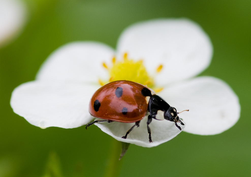 Siebenpunkt-Marienkäfer auf Erdbeerblüte.