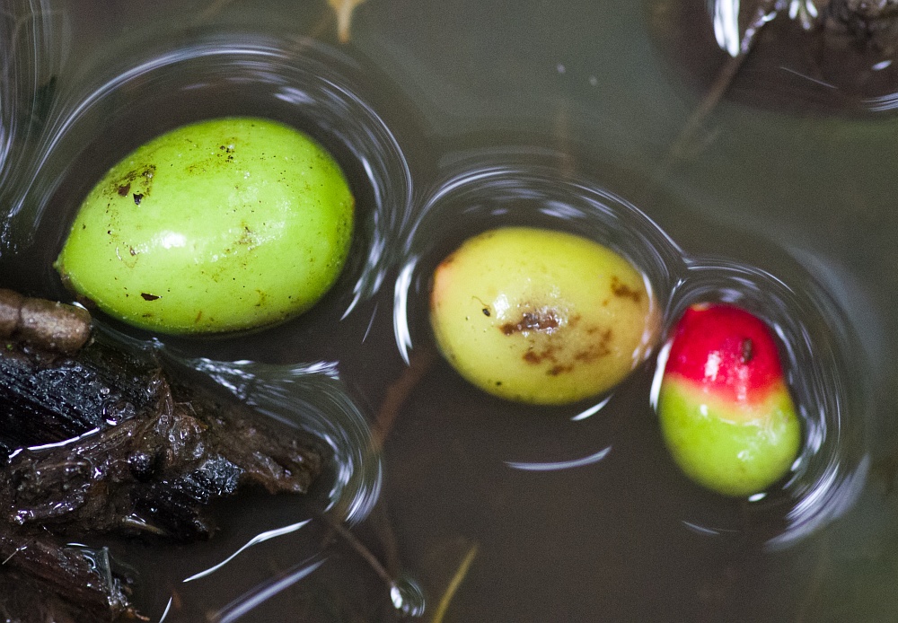 Vom Regen heruntergeworfene unreife Mirabellen.