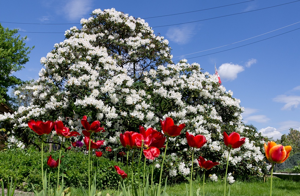 Auch mehrere Rhododendren fanden wir vor, wie z.B. diesen riesigen weißen. Leider musste er 2014 stark zurückgeschnitten werden, da er unter seiner eigenen Last teilweise zusammengebrochen ist.
