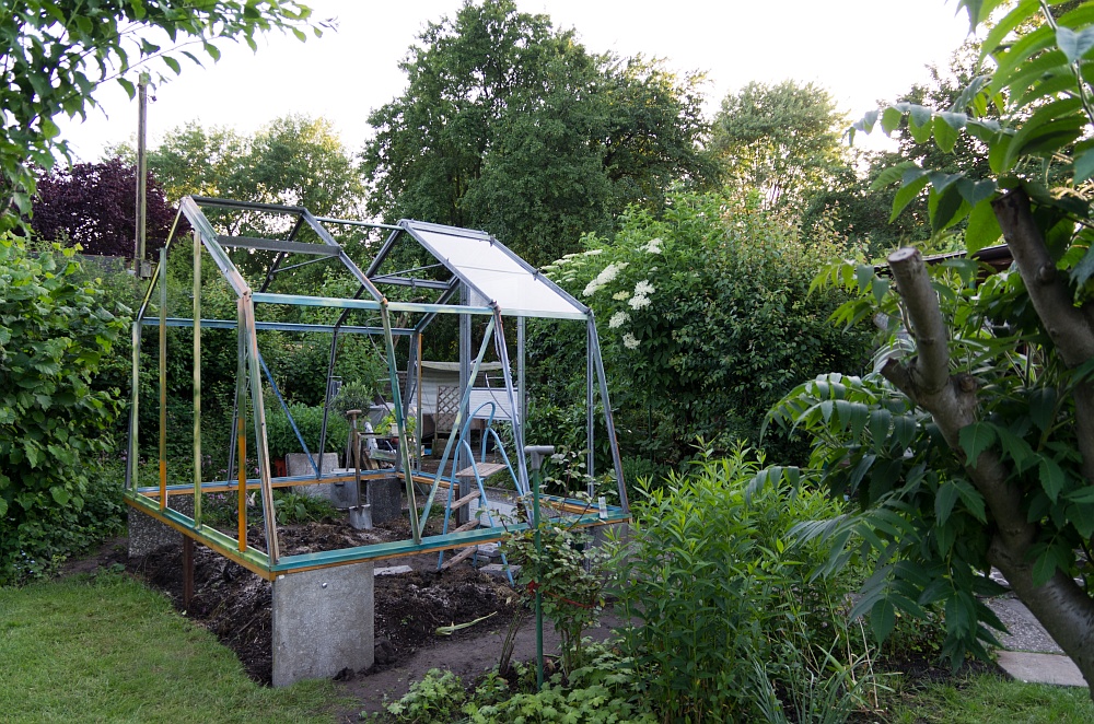 Das Fundament aus 2 großen Betontreppenstufen und 2 50x75cm Gehwehplatten für die Ecken steht, der Metallrahmen ist aufgebaut und nach ein paar Bier bunt besprüht worden, die ersten Scheiben sind eingesetzt.