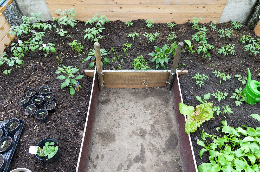 Mai 2014. Insgesamt 8 verschieden vorgezogene Tomatensorten werden gepflanzt.