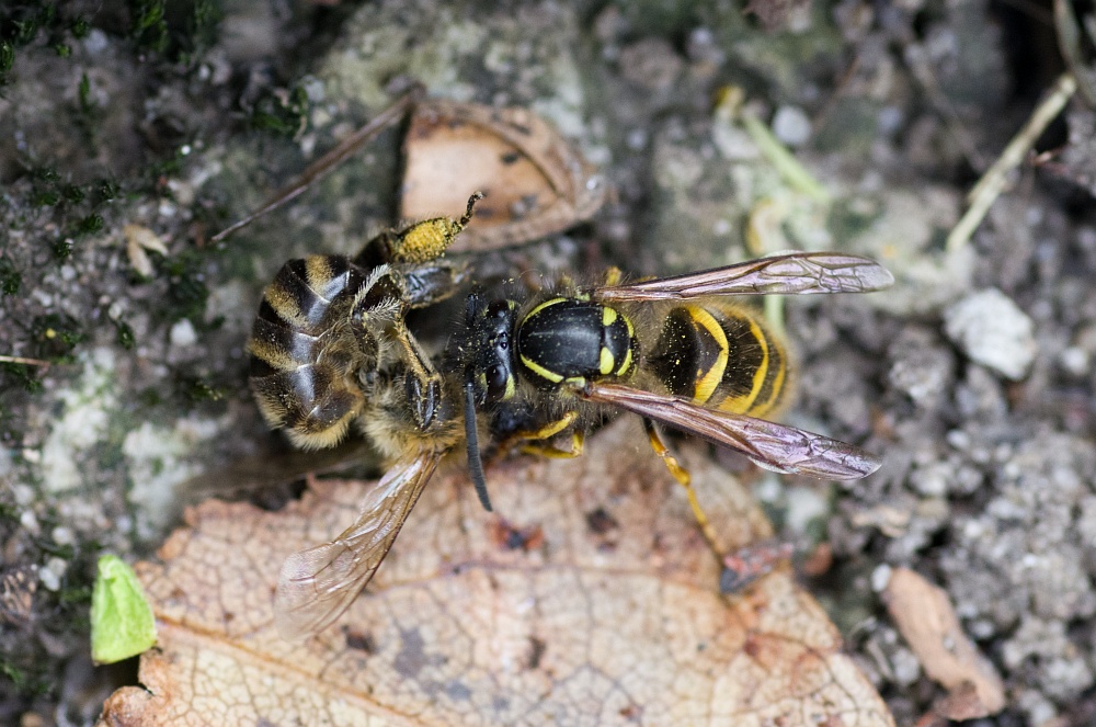 Eine Gemeine Wespe im Kampf mit einer Honigbiene.