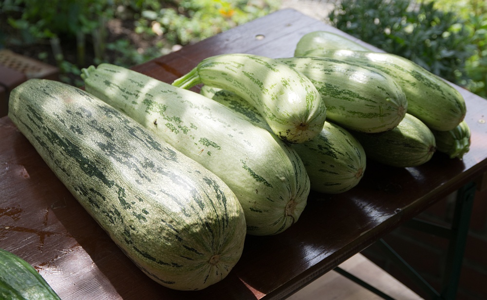 2013, reichhaltige Zucchiniernte. Links sind die beiden Monster zu sehen, die wir in dem Dschungel übersehen hatten. Die größere war 45cm lang.