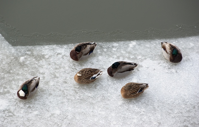 Enten beim Nickerchen auf einer Eisscholle (Januar 2010).