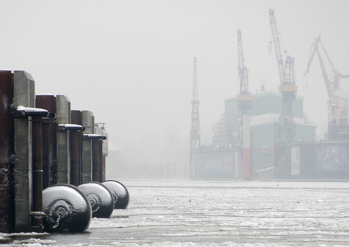Blick zum Dock 10, links der Kai des zukünftigen Altonaer Kreuzfahrtterminals (Januar 2010).