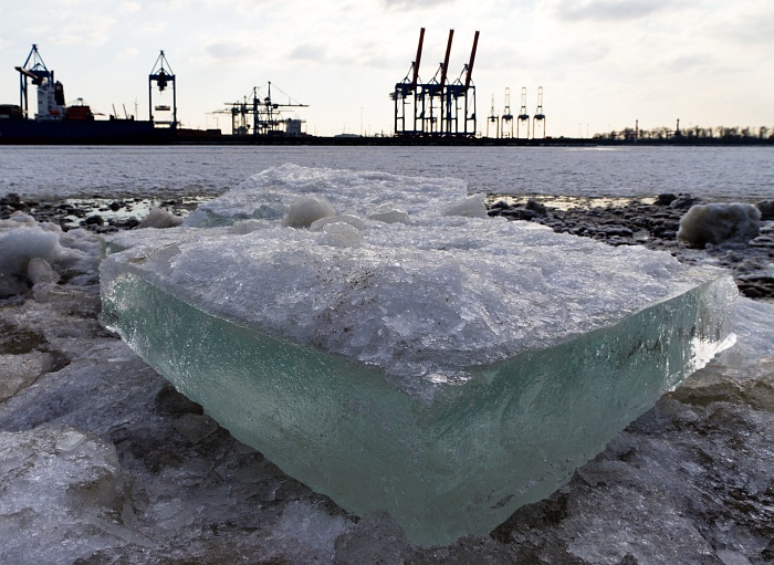 Grüne Eisscholle am Övelgönner Strand (Februar 2012).