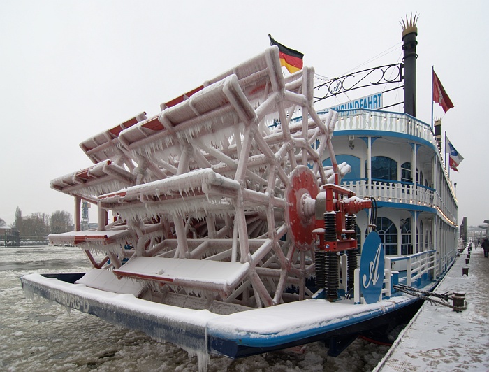 Vereistes Schaufelrad des Raddampfernachbaus Louisiana Star (Januar 2010).