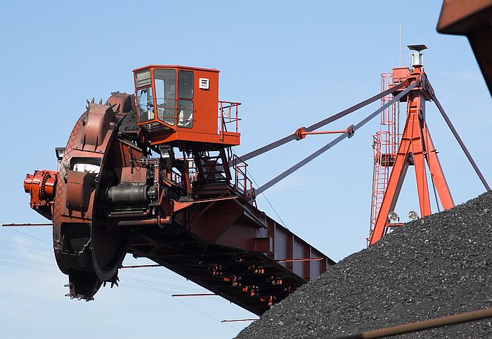 Die riesigen Schaufelradbagger befördern die Erze auf Förderbänder, die zum Schüttgebäude führen.
