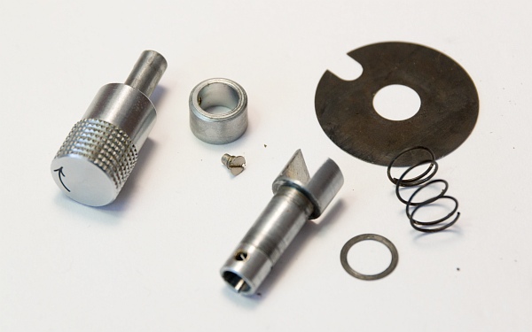 Als erstes entfernen wir den Selbstauslöserhebel. Achtung, Linksgewinde! Das Ding kann recht fest sitzen. Wer keinen kleinen Spanner hat entfernt es entweder mit einem Gummihandschuh oder einem Radiergummi (links unten). Die Teile des Selbstauslöserhebels. Der Hebel, der Connector zwischen Hebel und dem Selbstauslöser, Schraube und Dichtung (unten). |