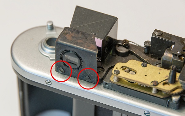 Aber der Messsucher ist vertikal ziemlich dejustiert. Um den Versatz zu justieren muss der Deckel abgenommen werden. Dabei ist einiges zu beachten. |