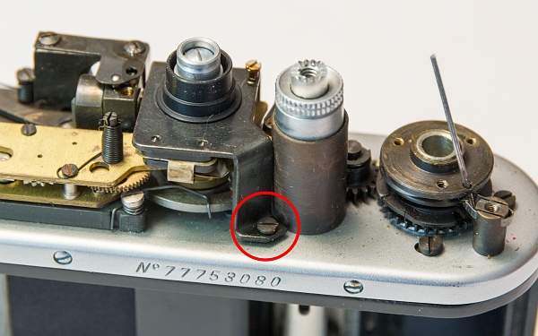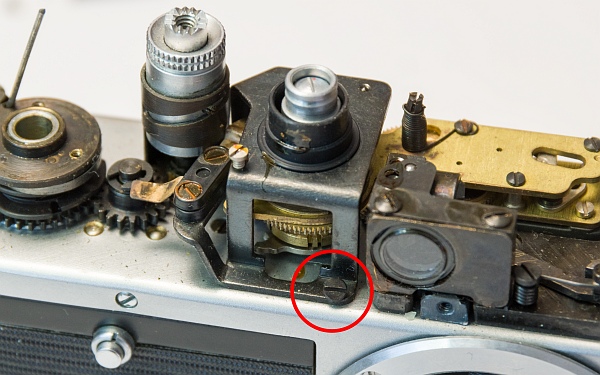 Mittels dieser Linse wird der vertikale Versatz justiert. Dreht man sie nach links, wandert der Messsucherfleck nach oben, nach rechts dementsprechend nach unten. Die Linse ist mit Schellack fixiert. Mit einem kleinen Pinsel wird etwas reiner Alkohol bzw. Isopropanol in den Spalt geträufelt, nach ein bis zwei Minuten kann die Linse dann mit einem Spanner verdreht werden. Nach Verdunsten des Alkohols sitzt sie wieder fest. Den horizontalen Versatz justiert man mittels der kleinen Schraube rechts im Kreis. Ursprünglich wollte ich ja nur den vertikalen Versatz justieren und habe daher den Body nicht abgebaut. Aber ich habe mich dann entschlossen, die Kamera weiter zu zerlegen um sie komplett zu warten. |