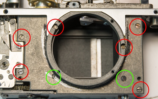 Nach dem Entfernen der unteren Abdeckung des Verschlusses (2 Schrauben) sehen wir die Spannschrauben der Federn des ersten und zweiten Vorhangs. Diese wurden anscheinend bei dieser Kamera noch nie nachjustiert, der Sicherungslack ist immer noch intakt (links). Enfernen wir nun den Schraubring für die Objektive und die Gehäuseschrauben. Achten Sie auf die Wachspapierscheiben zur Justage des Auflagemaßes. Beim Wiedereinbau müssen diese exakt wie vorher positioniert werden. Eine der Gehäuseschrauben ist kürzer als die anderen. Sie gehört an diese Stelle (Pfeile). |