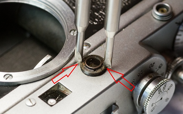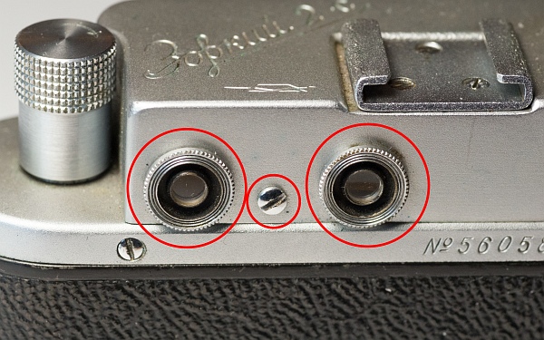 Um den Verschluss abzuschrauben, muss bei der Zorki C und 2C vorher der Messsucher entfernt werden, da der Verschluss hier von oben festgeschraubt ist.