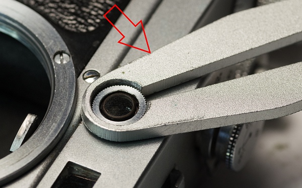 Der Hebel des Selbstauslösers wird entfernt, die große Schraube hält ihn fest. Der Auslösehebel mit dem kleinen Pfeil lässt sich gegen den Uhrzeigersinn abschrauben, hilfreich dabei ist ein Gummihandschuh (unten).