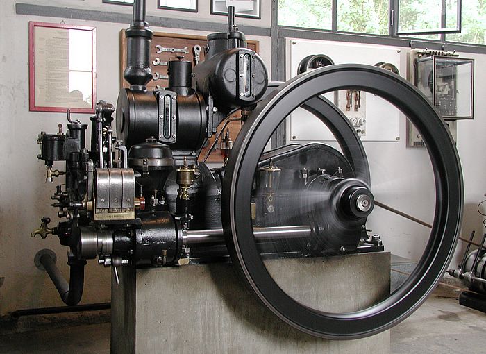 Die Erfindung des Otto-Motors war daher eine richtige Arbeitserleichterung. Seitdem mußte man die verschiedenen Maschinen nicht mehr mit Muskelkraft antreiben. Dies ist ein Deutz-Motor aus dem Jahr 1916 mit einer Leistung von 5 PS. Hier im Museum treibt er über einen Transmissionsriemen eine Bohrmaschine an. Der Unterschied bei der Bearbeitung eines Werkstücks ist enorm. Erkauft wurde die Arbeitserleichterung allerdings mit recht viel Lärm, der Deutz-Motor nicht ist nicht gerade leise.
