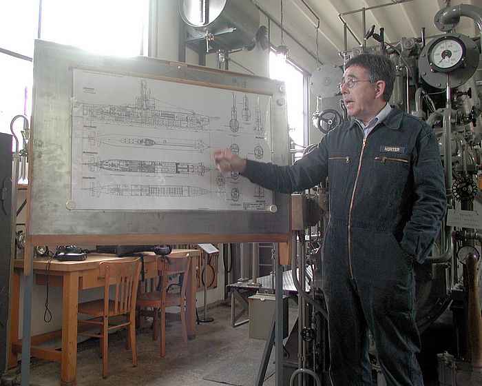 Zum Höhepunkt des Tages erklärte Herr Horter uns die Geschichte des Dieselmotors. Der U-Boot-Dieselmotor hinter ihm wurde 1944 gebaut und war für ein U-Boot neuerer Baureihe bestimmt. Er wurde jedoch nie eingesetzt. 1978 wurde er in einem unterirdischen Bunker wiedergefunden und in Einzelteile zerlegt herausgeholt.
