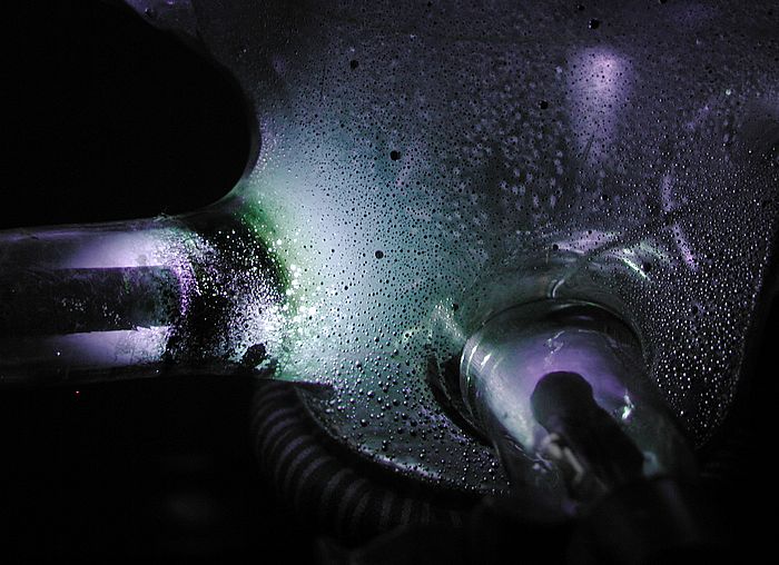 Nahaufnahme des Bereichs um die Heizelektroden. Man sieht, wie das verdampfte Quecksilber sich am Glaskolben niederschlägt. Je nach erzeugter Leistung leuchtet der Glaskolben schwächer oder stärker.