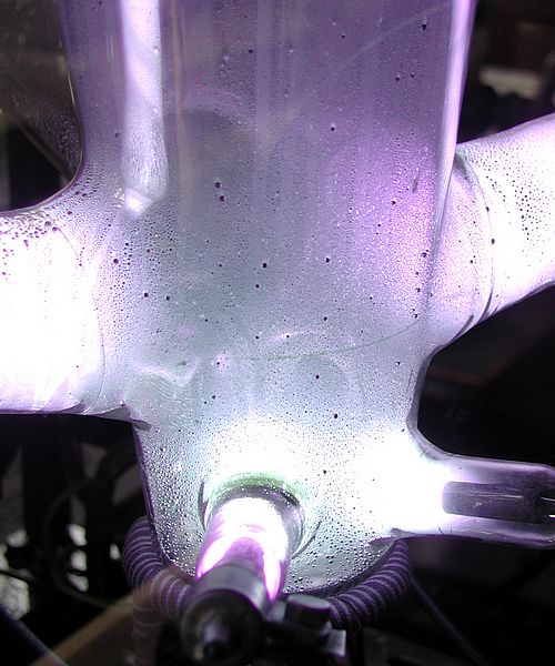 Blick auf den unteren Teil des Glaskolbens. Unten sind die Anschlüsse der Heizelektroden, Mitte links und rechts jeweils ein Arm einer Phase.