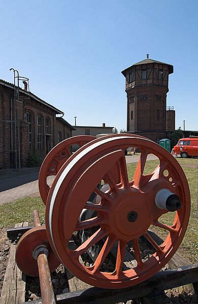Das mittlere Antriebsrad einer Dampflok mit Mittelzylinder. Im Hintergrund der das Bahngelände prägende Turm. (2006)