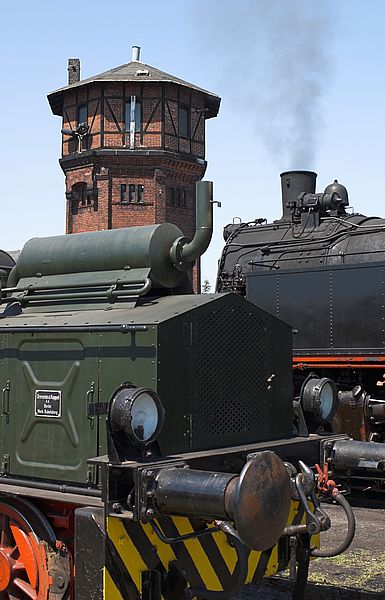 Im Vordergrund eine funktionsfähige Dampfspeicherlok. Diese kleinen Rangierloks haben keinen Brennraum, sondern wurden mit Dampf, der aus Abwärme erzeugt wurde, befüllt. (2006)
