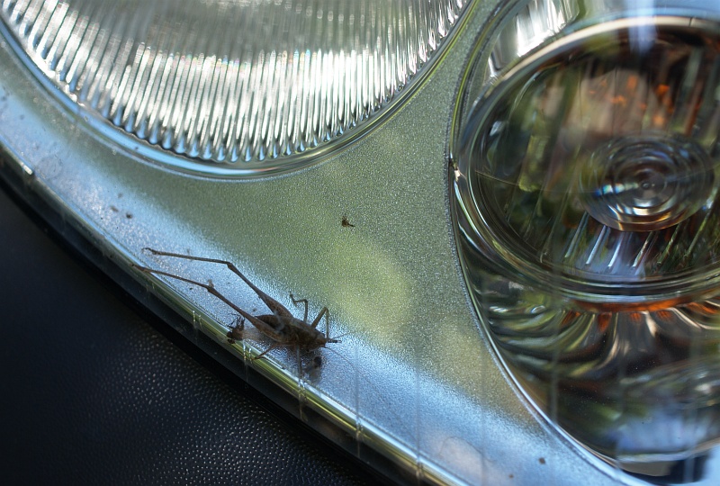 Irgendeiner der Teilnehmer des Treffens hat einen Grashüpfer in seinem Autoscheinwerfer!