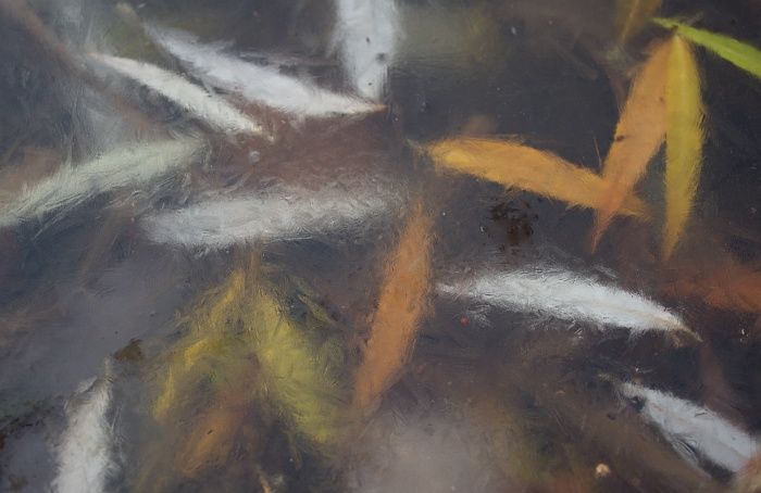 Eingefrorene Weidenblätter im Eimsbütteler Weiher (Dezember 2010).
